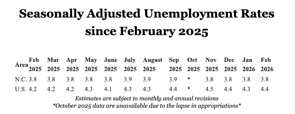 Raleigh, N.C. - The state’s seasonally adjusted February 2026 unemployment rate was 3.8 percent, unchanged from January’s revised rate. The national rate increased 0.1 of a percentage point to 4.4 percent.